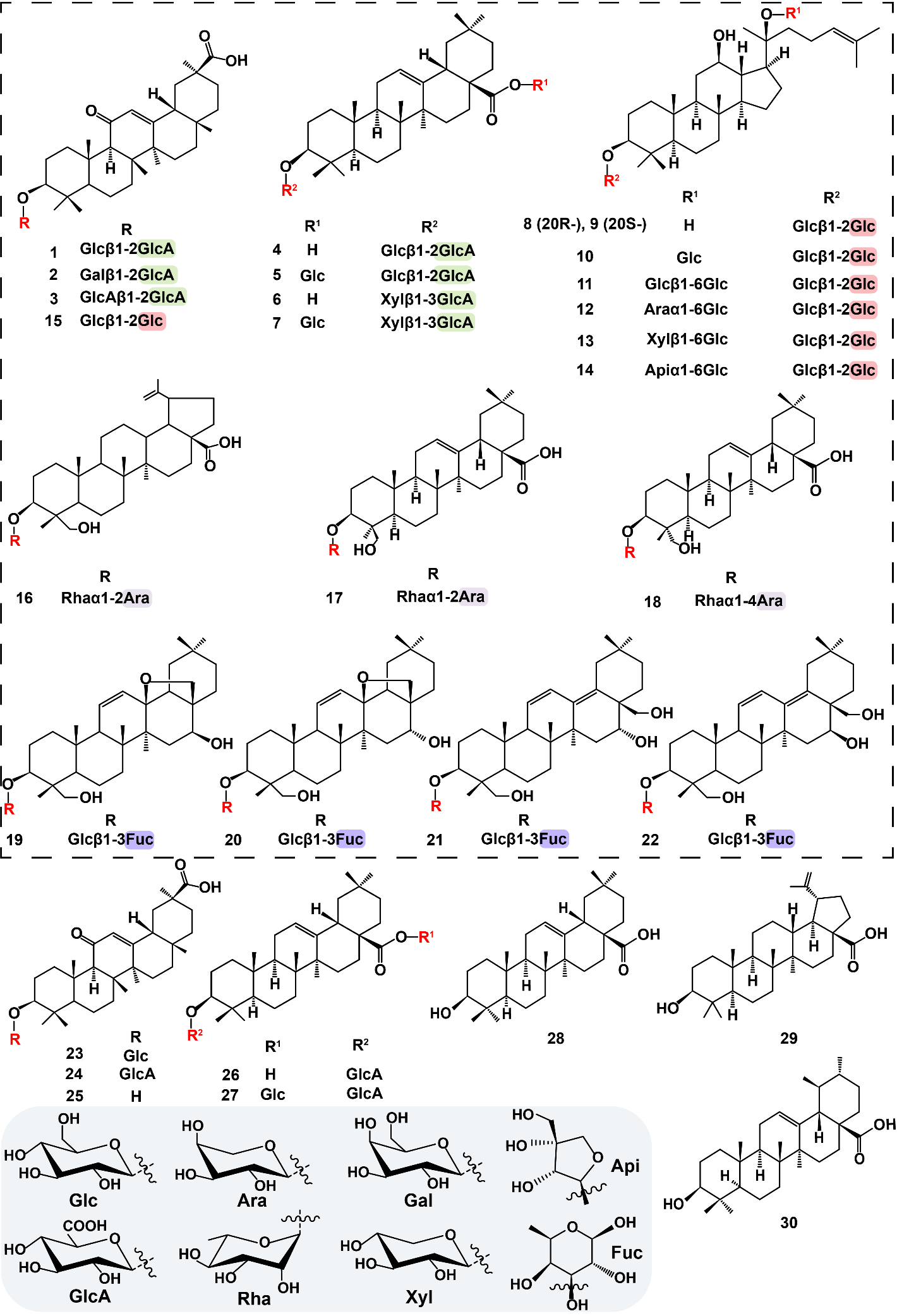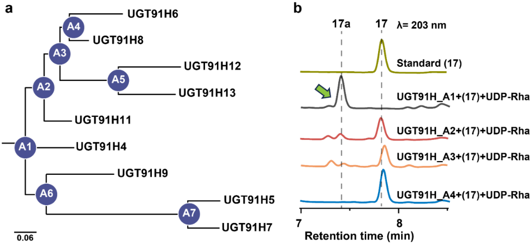 利用祖先酶序列重构技术获得UGT91H亚家族的祖先酶UGT91H_A1, 其在保留UGT91H亚家族现代酶直链三糖基修饰功能外,表现出了更广的底物谱和更高的活性。在糖基受体方面,UGT91H_A1可催化17个三萜化合物修饰一分子糖基。在糖基供体方面,除UDP-Rha和 UDP-Xyl之外,UGT91H_A1还具有高效利用UDP-葡萄糖(UDP-Glc)的活性。最后利用UGT91H_A1成功合成了 33个三萜直链三糖苷。