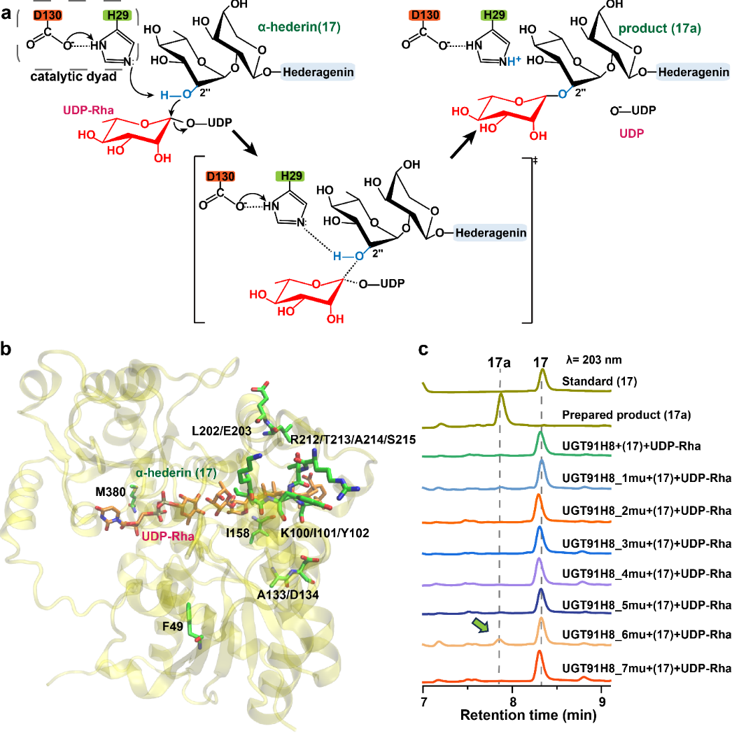 进一步阐明了UGT91H_A1中非保守的RTAS Loop对UGT91H亚家族酶的底物特异性具有重要影响。将RTAS Loop替换至UGT91H8 和UGT91H7对应区域,分别获得突变体UGT91H_6mu和UGT91H7M,均具有催化新底物α-常春藤苷(17)糖基修饰的活性。分子动力学模拟和量子力学计算表明,RTAS Loop通过影响酶和底物的相互作用和结合能来调控酶的底物特异性。