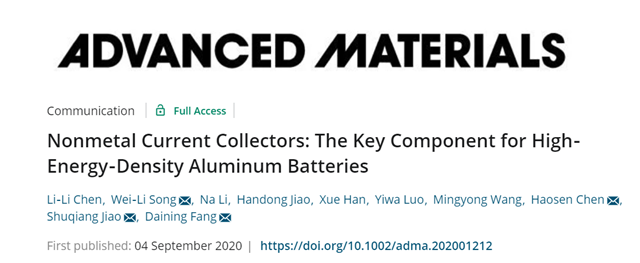 9月4日,国际顶级材料期刊《先进材料》 Adv. Mater. 2020, 2001212(期刊IF="27.398)以“Nonmetal current collectors: the key component for high energy density aluminum batteries”为题在线报道了多宝(中国)一站式服务官网先进结构技术研究院方岱宁院士与宋维力团队在非金属铝离子电池集流体的设计及应用方面的进展。