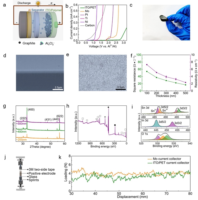 图1. 非金属ITO/PET集流体的特征。铝离子电池与稳定的ITO/PET集流体。(a)铝离子电池放电过程示意图。(b)不同集流体材料在AlCl3/[EMIm]Cl(比例~1.3)离子液体电解质体系中的极化曲线。(c)涂覆正极材料的ITO/PET集流体图片。(d,e) ITO/PET集流体的横截面及平面的SEM图像。(f)不同ITO溅射厚度(样品从100到500nm)的表面电阻和电阻率。(g)不同溅射厚度ITO的XRD衍射谱。(h) ITO的XPS光谱,其中符号表示:In 3d (♦)、Sn 3d(△)、O 1s (x)、C 1s(●)、In(□)、Sn (▽), O (○)。(i) Sn、In、O的XPS谱。(j)用于剥离强度试验的力学拉伸器示意图。(k)不同集流体剥离强度数据。