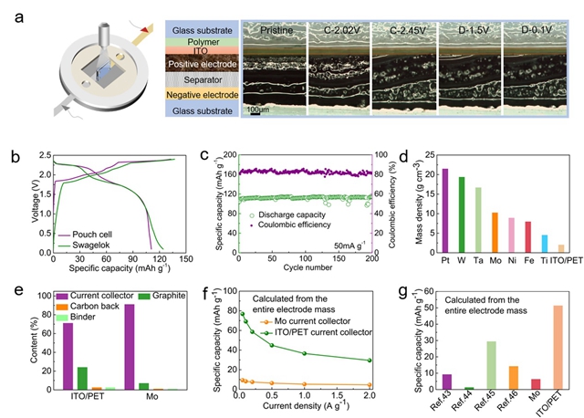 图4. 整体性能评估。(a)光学电池设备图,单个电池内部结构,不同充放电状态的现场光学图片。(b)不同类型电池的充放电循环。(c)使用基于软包电池装置的ITO/PET集流体的全电池循环数据(50 mA g−1)。(d)各种集流体的质量密度。(e)整个正极的活性石墨、集电极、炭黑和粘合剂的质量占比。(f)以ITO/PET和Mo作为正极集流体的全电池的比容量。(g)比较其他全电池研究中石墨正极与各种集流体的比容量(从整个电极质量计算),其中电极参数由相应的参考文献提供[43−46]。