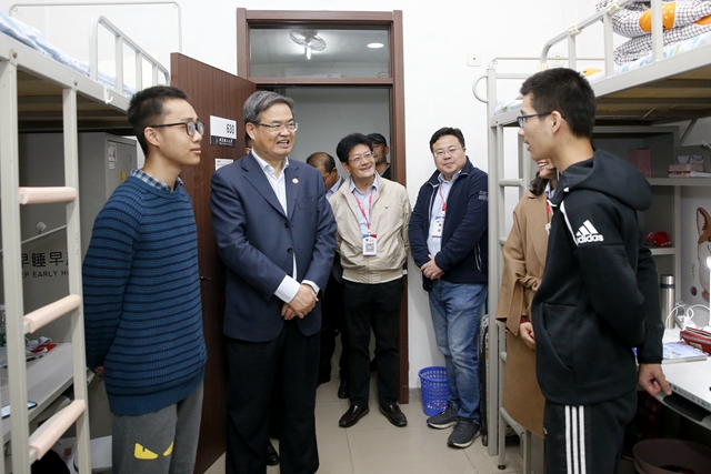 最后,校长抵达了特立书院社区,到博雅园学生宿舍看望新生。在强基班的630宿舍中,校长亲切地询问和了解了学生的情况后,语重心长地说到:“基础课程是我国科学研究的重要基础,今年是学校首次招收强基计划学生,这意味着我校拔尖创新人才培养进入新的阶段”。“强基固本、寰宇致远”,“立报国志,将来为国家做贡献”,校长对首届强基班学生提出了殷切期望。