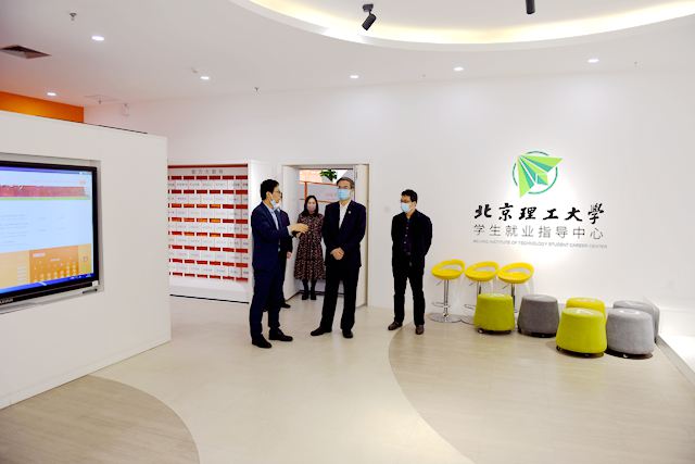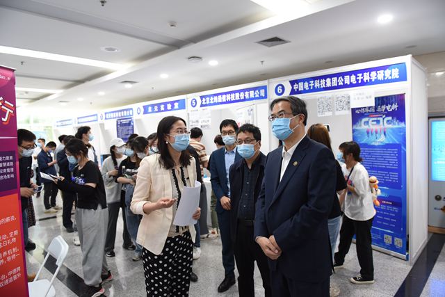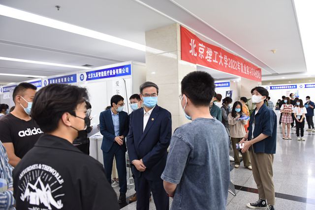 招聘会现场,校党委书记张军院士、副校长庞思平带队,与参会单位进行亲切交流,介绍学校人才培养优势和专业特色,了解单位吸纳北理工学生就业实习情况和春招工作进展,并与在场学生进行沟通,询问求职意向及应聘情况。
