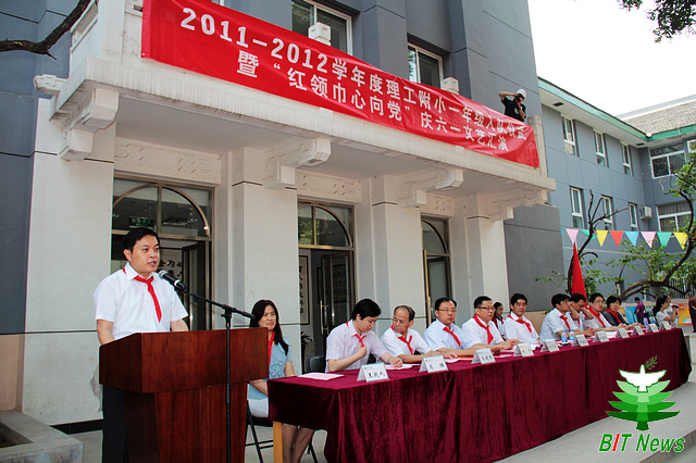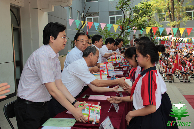 5月31日上午,在理工附属小学少先队一年级入队仪式上,胡海岩校长、赵显利副校长与学校办公室党支部党员代表亲手将精心挑选的一百本优质题材图书交到了少先队员代表手中,并鼓励他们好好学习,努力成才。附小的少先队员代表为他们戴上了鲜艳的红领巾,表达了由衷的感谢和崇高的敬意。