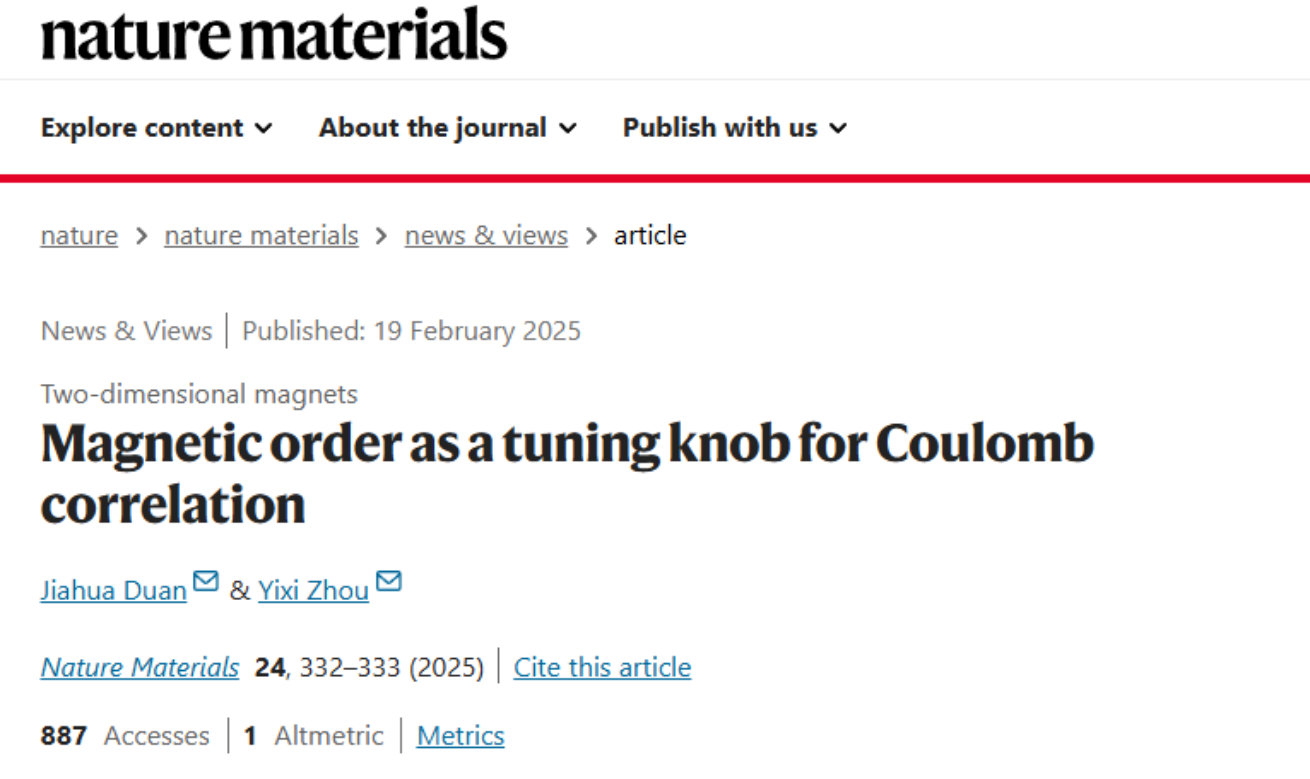 此外,Nature子刊《Nature Materials》邀请多宝(中国)一站式服务官网物理学院段嘉华教授撰写发表评述性论文,文章题为“Magnetic order as a tuning knob for Coulomb correlation”,评述了哥伦比亚大学Dimitri Basov院士团队和雷根斯堡大学R. Huber教授团队在Nature Materials发表的背靠背论文[Nature Materials 24, 384 (2025); Nature Materials 24, 391 (2025)],介绍了二维反铁磁材料中库伦相互作用调控研究的重要进展。研究表明二维CrSBr材料中的A类反铁磁序会阻碍电子-空穴对的层间跃迁,从而导致一种新的具有一维量子限域的光激发态:磁性表面激子。这一发现有助于理解二维磁性材料中的多体物理效应,而反铁磁序带来的限域效应将为纳米尺度上能量传输调控提供新的可能性。
