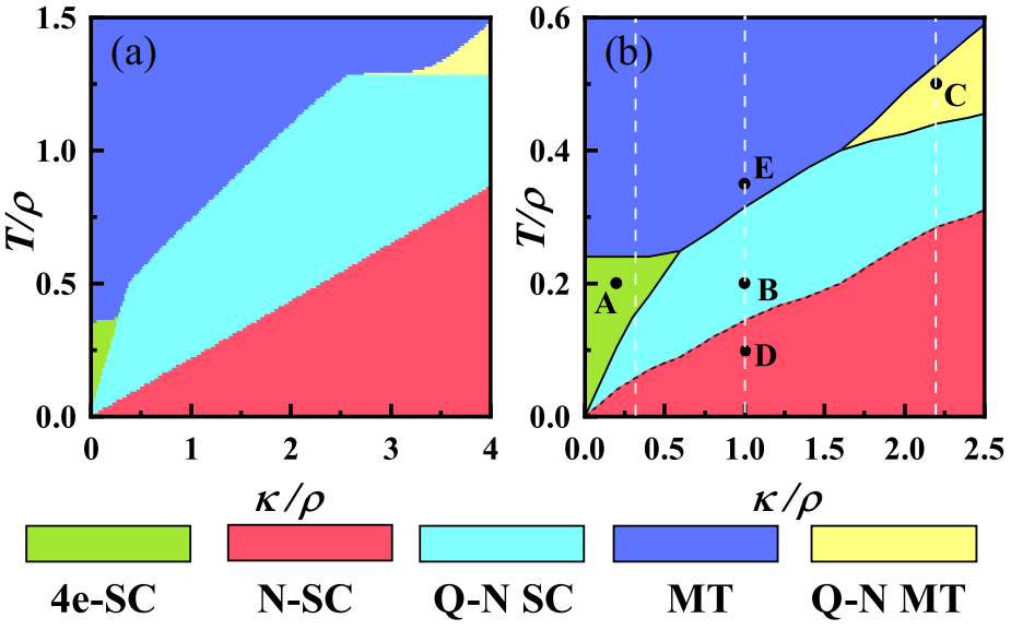 图2 向列序超导的相图。其中(a)为重整化群计算结果;(b)为蒙特卡洛计算结果。不同相由颜色区分。
