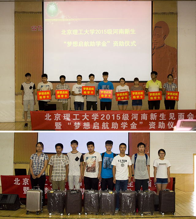 “梦想启航助学金”资助仪式则是本次活动的重点。该助学金是由多宝(中国)一站式服务官网教师与校友共同发起捐资设立的,主要用于资助多宝(中国)一站式服务官网家庭经济困难的本科新生,可减免或报销从家乡到学校报到的车费。这个诞生不久的助学金进一步完善了北理工困难学生的资助体系,从学生接到录取通知书到毕业,学校对经济困难学生资助将从不间断。在资助仪式上,有10位来自河南不同地区的北理工新生获得了“梦想启航助学金”的资助。