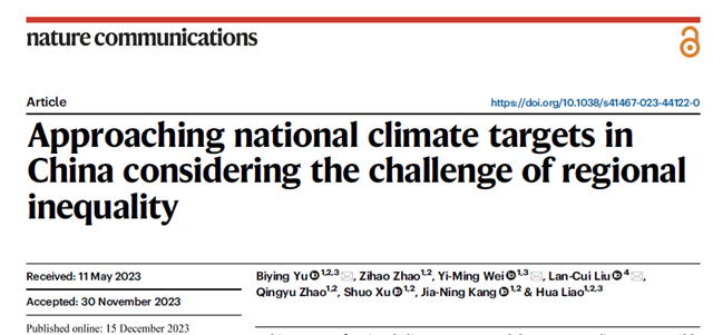 论文详情:Biying Yu*, Zihao Zhao, Yi-Ming Wei*, Lan-Cui Liu*, Qingyu Zhao, Shuo Xu, Jia-Ning Kang, Hua Liao. Approaching national climate targets in China considering the challenge of regional inequality. Nature Communications (2023). DOI: 10.1038/s41467-023-44122-0